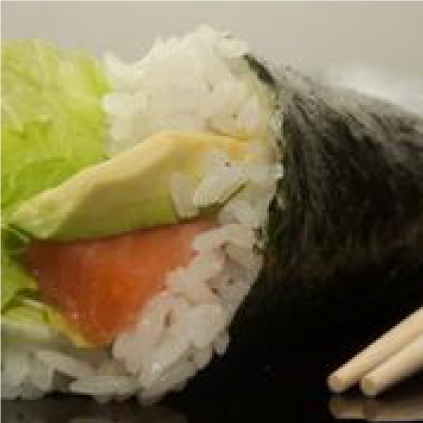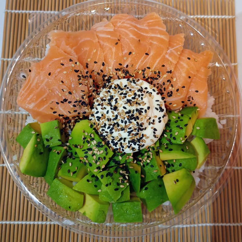 Arroz Gohan, salmón fresco, palta, philadelpgia y semillas de sésamo.